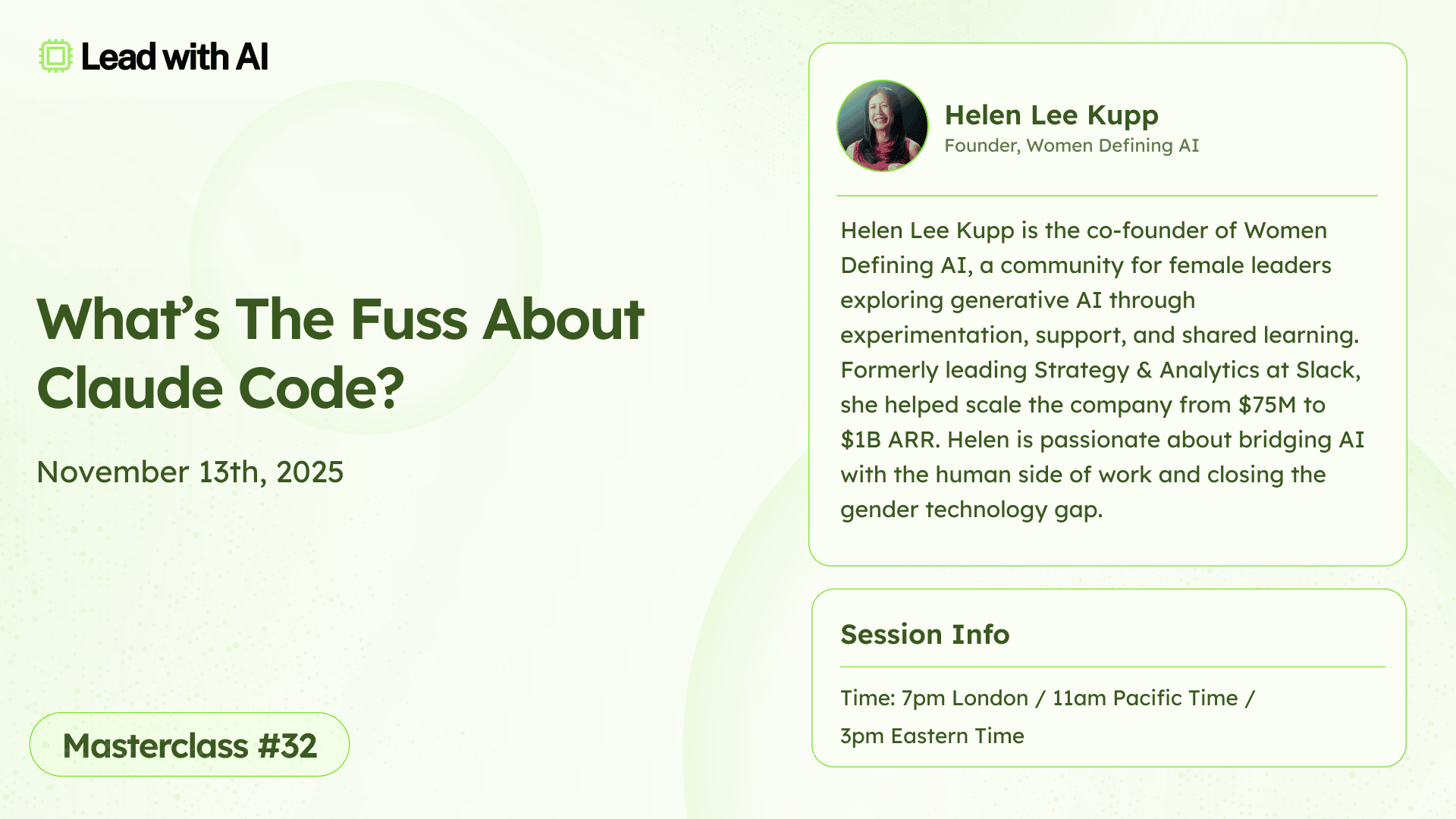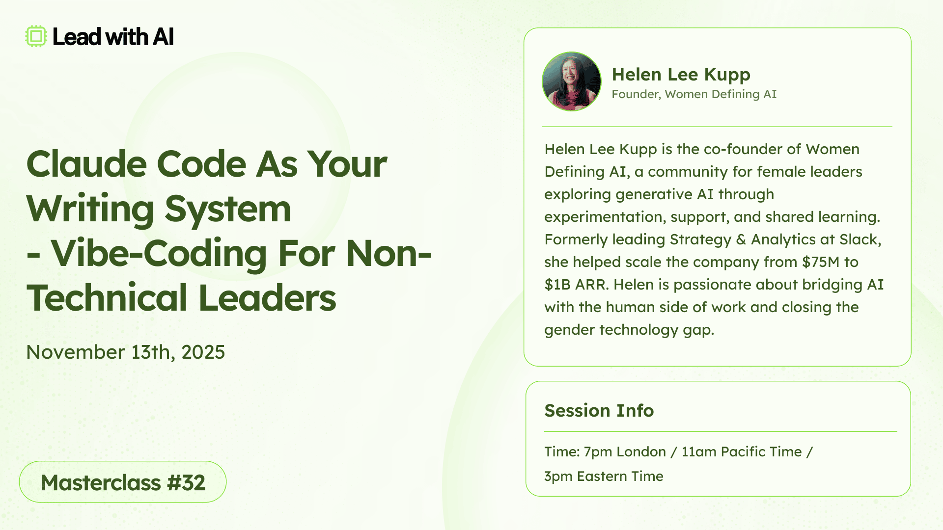 Hosted by Helen Lee Kupp, founder of Women Defining AI, this hands-on workshop is for non-technical leaders who are curious about Claude Code and want to understand how it can be used to think and build systems in powerful new ways.
